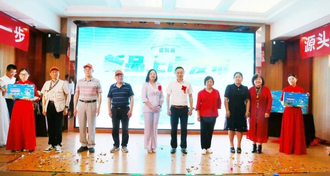 老来寿集团副总经理张伟、华东运营中心总经理周金晶、品鉴官代表程玲琪、张佐权、黄善良、赵由珍、李秀兰、汤家霞共同上台为老来寿特膳新品【植物硒肽锌维片】启动上市发布!